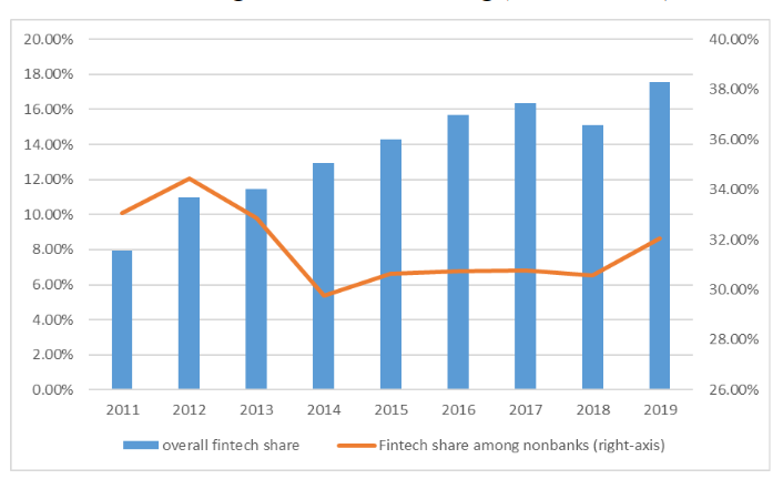 (Graph by economists Dean Corbae, Pablo D’Erasmo, and Kuan Liu. “Market Concentration in Fintech,” published by the Philadelphia branch of the Federal Reserve, entitled “Market Concentration in Fintech,” Working Paper 23-11, June 2023. )