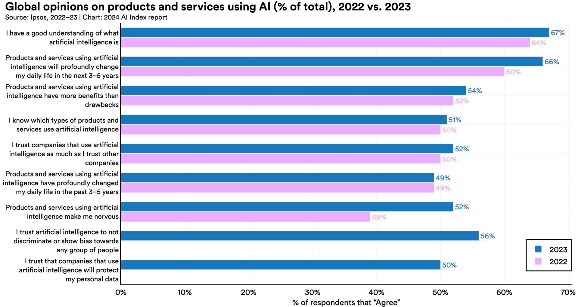 Today’s graph comes from an annual report published by Stanford University on the state of Artificial Intelligence. It demonstrates that more and more people sense something profound is happening, but few have a good grasp of what that might be. Already Elon Musk claims Tesla is not a car company but an AI company. Certainly the OpenAI and its ChatGPT, Google with its Gemini AI, Microsoft's Copilot, Facebook's Meta AI, Apple's Intelligence, and Elon Musk's AI-ification of Tesla are all driven to generate profits for the shareholders of some of these largest corporations in the world. They obviously believe in the profits they can generate by monetizing and selling information about the buying habits and choices of you and me. Their huge investments into AI are made with a good sense of where this will take them and us, but I’m afraid they aren’t revealing the full plan, though.