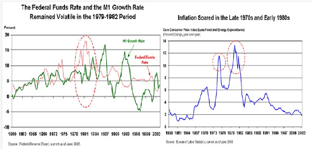 Today’s chart shows that inflation was already building to intolerable levels in the mid to late 1970s. Think of that as the first round, which arose as the OPEC oil embargo forced up energy prices. As that inflation was building, the Fed actually took its foot OFF the brake, and cost-push inflation accelerated.