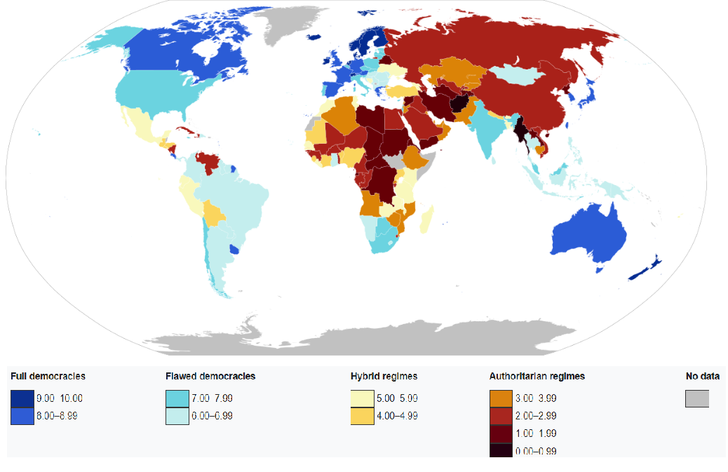 (graphic courtesy The Economist Intelligence Unit Democracy Index, https://commons.wikimedia.org/wiki/File:Economist_Intelligence_Unit_Democracy_Index_2023.svg)
