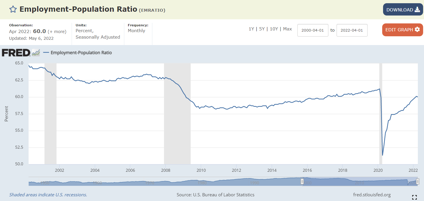 As we come out of our Covid shell and start spending again, we have overwhelmed the supply chain and instead just raised prices. This cranked up inflation. In addition, the Great Resignation means that the workforce has shrunk, which is why it is so easy to maintain a low unemployment rate. But, it also translates into higher wages, which further stresses inflation.