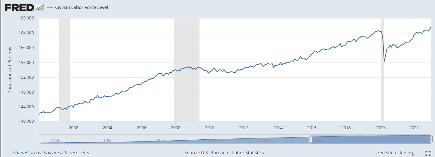 The greater problem is what happened next. Even if we anticipate slower growth of the labor force as our population grows but our baby boomers continue to retire for about another ten years, we are still missing about four million workers. If you extrapolate the labor force growth since the Great Recession but ignore the Global Pandemic, you notice that a good chunk of the labor force disappeared and have not since come back to the pre-pandemic trend line.