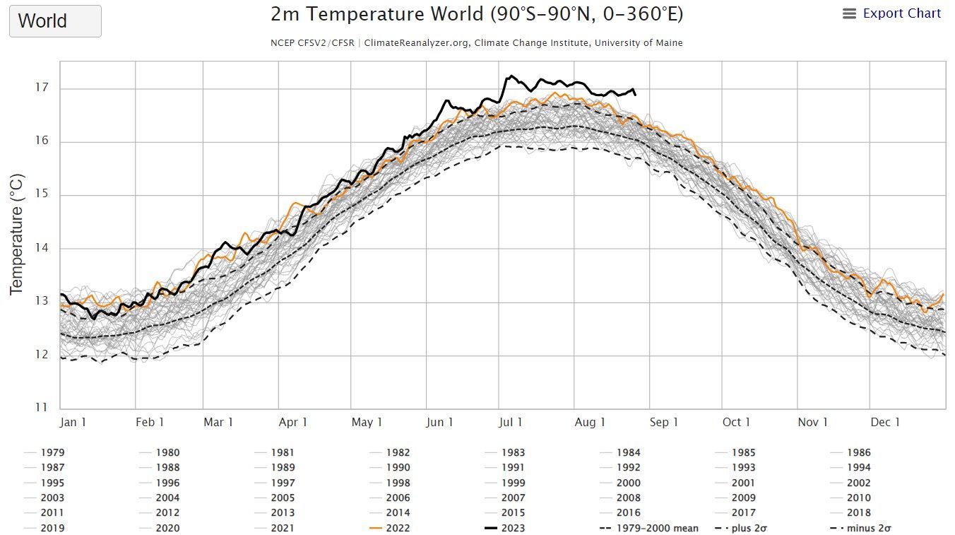 Only the years 2002, 2005, and 2016 had a day or two that was warmer than the corresponding day this year. Otherwise, 2023 will go down as a record-smashing year, at least until 2024.