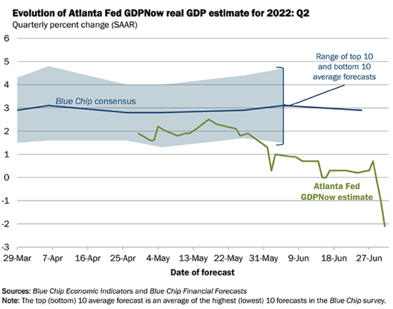 The Atlanta District Bank of the Federal Reserve publishes a real time estimate of U.S. GDP based on observation of other data closely correlated with GDP. They stated on Friday that second quarter growth is expected to come in at -2.1%, even worse than the first quarter.