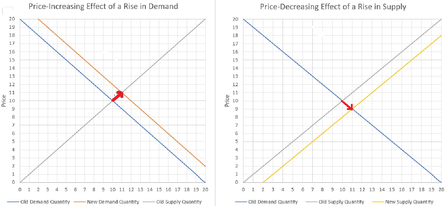 A well-trained labor force also reduces supply costs and shifts the supply curve outward. Rather than throw money at people laid-off during COVID, we should have mobilized a network of job retraining centers to create technical skills for a 21st Century workforce, skills that remain woefully missing in today’s economy. If a nation’s economy is at stake, is it unreasonable to encourage greater subsidization of college education in critical areas of national interest, as we encouraged more engineers in our halcyon days during the 1950s and 1960s when we were concerned about our competitive position not with China then but with the former Soviet Union. Labor cost savings through increased abundance of a trained labor force and their increased productivity improves supply.
