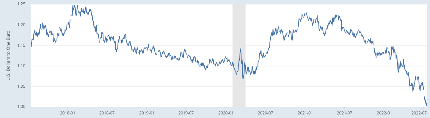 How about the exchange rate, though? One of the reasons why the ECB needed to raise its interest rate was to fight inflation, as we do in the U.S. as well. But, the other reason was to increase the value of the Euro. Its value had fallen to an almost historically low value of par with the dollar, which is fine for me as I follow the Tour de France, but not so good for European citizens who find that foreign goods are suddenly too expensive.