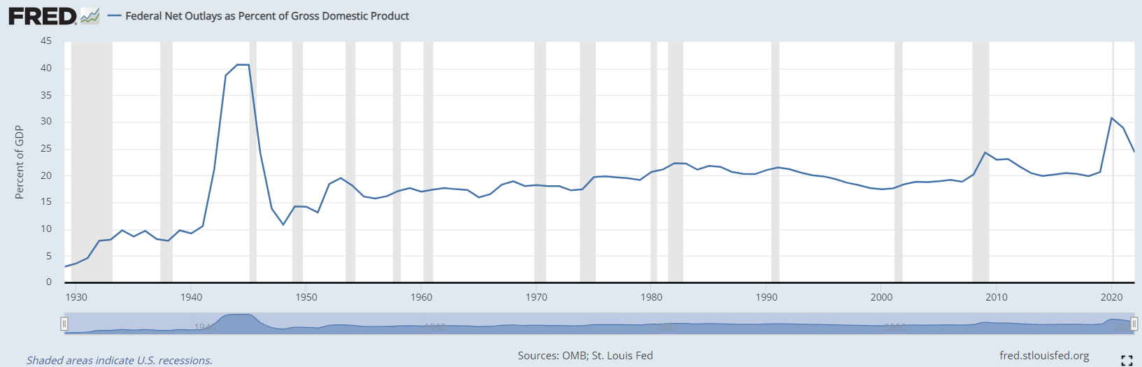 Our federal spending has been on the rise. When I was a child, we spent about 15% of our GDP on federal government spending. We zoomed past 20% in this century and are on our way to between 25% and 30% over the next decade or so. Add another 15% for state and local spending, and we see we are approaching the mark where half of our economy is spent in the public rather than private sector.