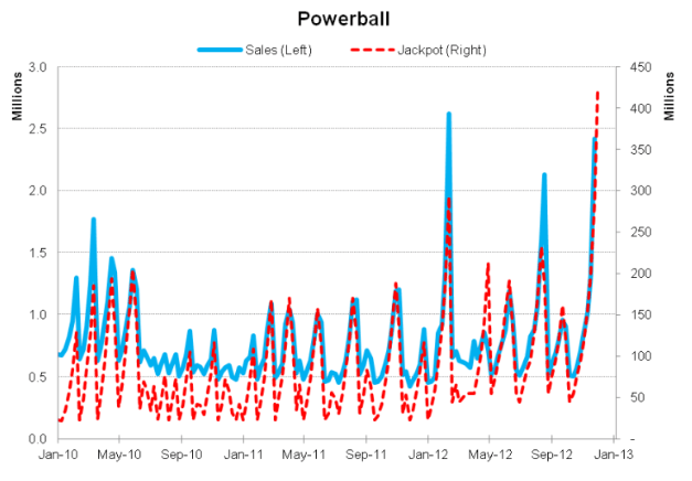 From an expected value perspective, and putting Bernoulli’s diminishing marginal utility of income aside, is then 2 in 400,000,000, or the equivalent of 1 in 200 million odds. The odds Powerball offers, at one in 292 million, assuming no cowinners, are vastly inferior to the necessary odds to simply equate expected values.