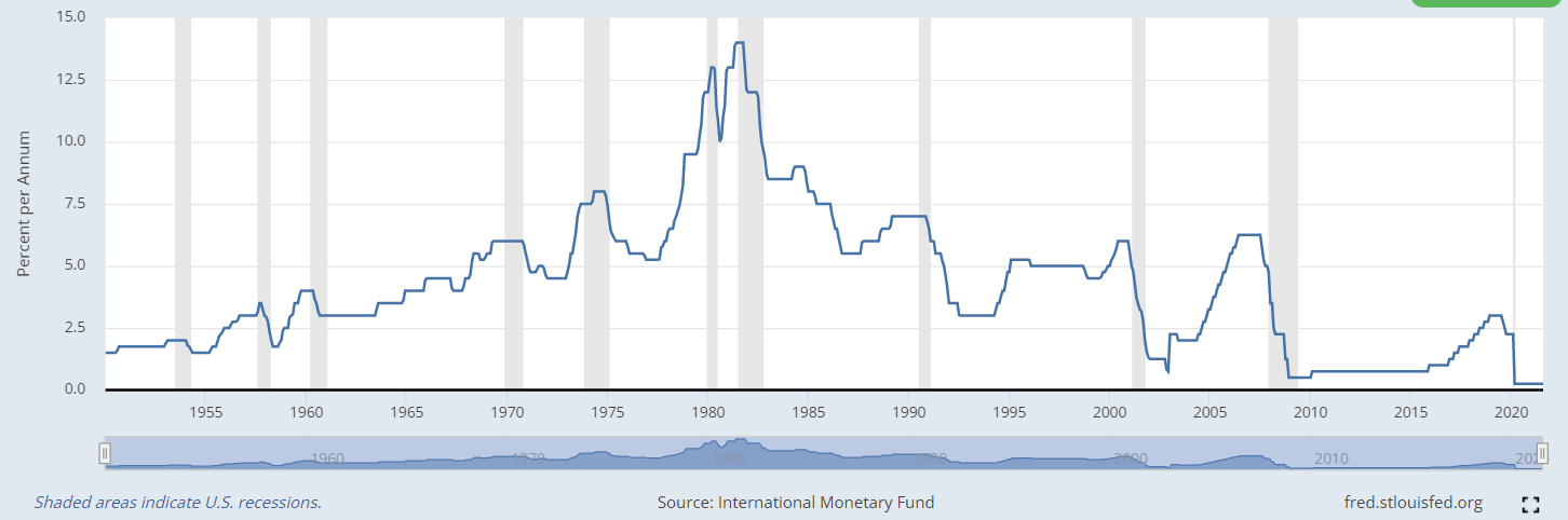 Diagram from: International Monetary Fund, Interest Rates, Discount Rate for United States [INTDSRUSM193N], retrieved from FRED, Federal Reserve Bank of St. Louis; https://fred.stlouisfed.org/series/INTDSRUSM193N, June 18, 2022.