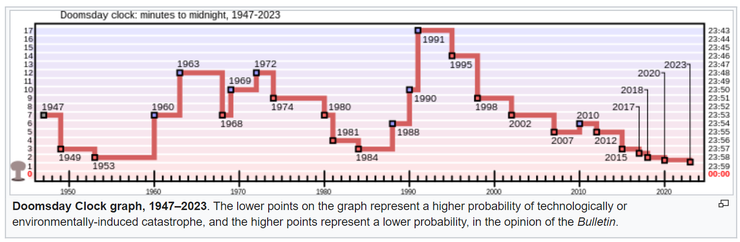 Instead, the Doomsday Clock has worsened ever since the 1990s, and is at its worst point ever now. The lot of all peoples of the world seems to be worsening rather than improving. Borders are not sacrosanct, and the U.S. recognizes threats in the Middle East, Russia and Ukraine, China, North Korea, and more regional violence and threats in Africa. As we discussed last week, the U.S. does not have the economic tools following the internationalization of economics in the wake of the Yom Kippur War and the OPEC oil crisis. Power and policing is dispersed, and the United Nations is unable to fill the vacuum.