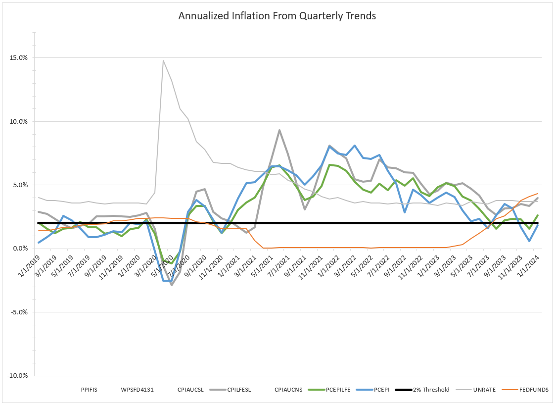 Today’s graph offers our monthly revision of various rates of inflation, including the Fed’s favorite Personal Consumption Expenditures Price Index (PCEPI). We see exactly what this blog has been observing for the past two years. When one compares annualized quarterly price data that the Federal Reserve most closely watches, inflation has been coming down steadily for the past two years. This process of inflation moderation began well before the Fed decided to raise interest rates.