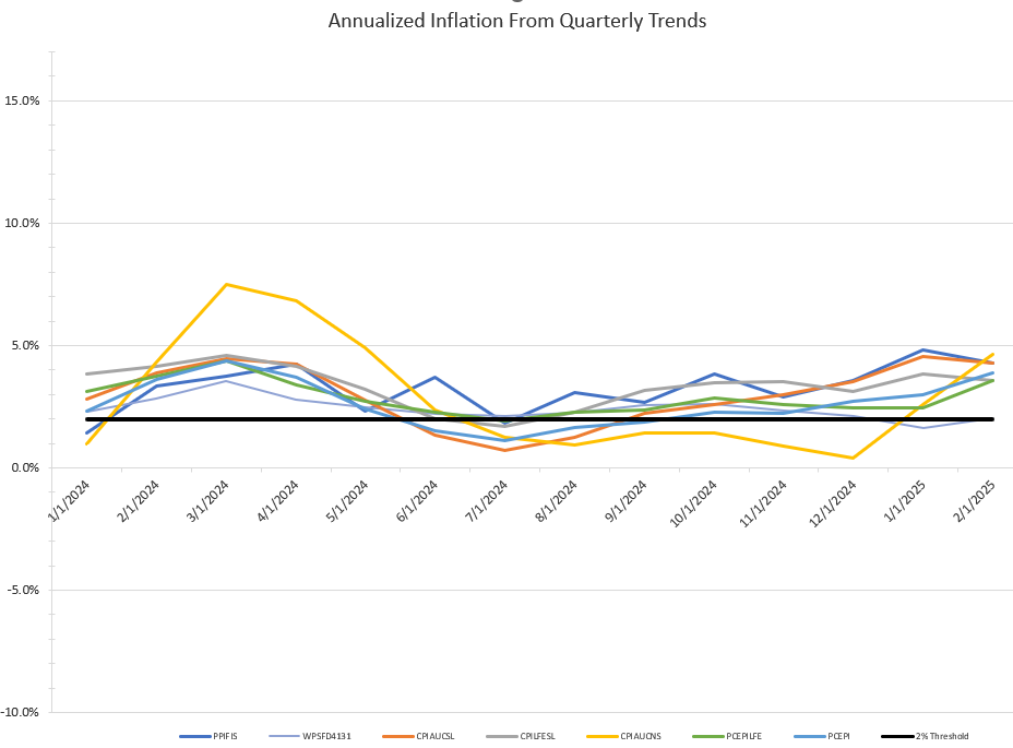 We now see on today’s graph that the inflation rate is ticking up pretty robustly. In fact, if you look at the quarterly trends that I calculate and publish in this blog series, you see that three month averages have been ticking up since the election and are now well above the level that the Federal Reserve deems tolerable. Worst yet is not the new levels, approaching and exceeding 3%, but the upward trend that seems destined to take inflation higher.
