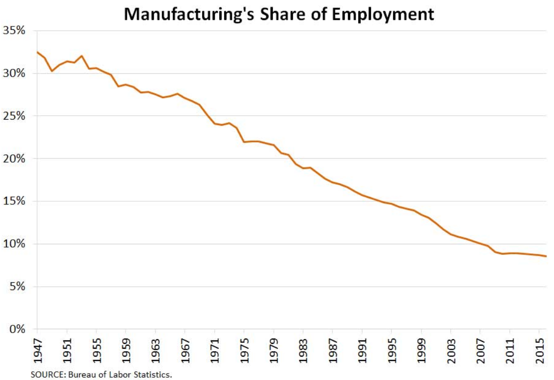 Agriculture never will constitute such a share of our economy because technology has dramatically reduced farm employment, and has brought down costs significantly. We can impose tariffs all we want but that won’t create more or more productive farms.