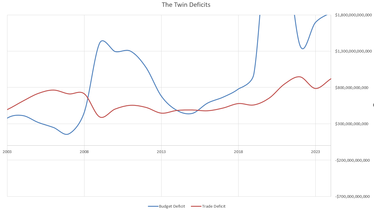 For instance, the US trade deficit in goods and services in January was about $130 billion, or about $1.56 trillion annually. Meanwhile, the US budget deficit is about $1.8 trillion. These numbers are typically quite close, as today's graph shows. There are a couple of periods in which the budget deficit spurted, during the Great Recession of 2008 and the COVID era. Those two eras saw the Federal Reserve funding much of the budget deficit temporarily through their radical monetary policy of massive bond purchases to ward off recessions. If those two periods are discounted, the correlation between the size of the budget deficit and its implications on the trade deficit (and hence the international capital surplus the US enjoys) are profound.