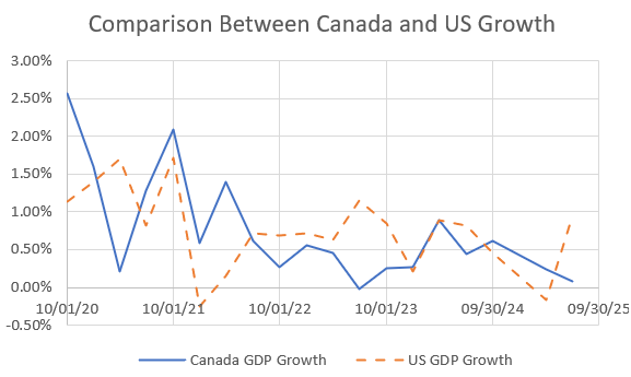 Canada is in the throes of budget approval, and Washington is merely trying to pass a Continuing Resolution to keep the lights on after failing to pass a budget by the October 1 deadline. In the U.S. the stakes are high. While the executive branch and both legislative branches felt they could pass the budget without any cooperation of the minority party, their attempt to use their majorities in every deliberative body failed. The opposition party asked and then demanded a negotiation over their prized Affordable Care Act health care program that was axed by the majority, but the majority preferred to shut government down rather than negotiate. In sending everybody home, and in ceasing all budget bill discussions in Congress, the U.S. federal government is at a standstill. Economic data has been embargoed, programs such as those who provide food to children in poverty have ceased, and commercial flights are increasingly grounded. At the same time, the minority government in Canada has presented its budget. The document is aspirational. It trims the government’s operating budget, but vastly expands investments in a nation that increasingly feels threatened by their American cousins. I expect the Canadian parliament will pass the budget. Their system encourages healthy discourse, and even requires the governing party to answer questions from the opposition parties once each day. But they also want the government to function, and would rather pass a budget than try to bring down the government. In fact, if a budget is ever rejected by vote, that automatically constitutes a no-confidence motion that forces an election. Some parliamentarians want more operating spending in the budget, some want less, but nobody wants the government to fall into dysfunction. Prime Minister Carney has a great deal of experience on Wall Street. He adopted a budgetary tool that I used to use as mayor, and which other governments and all corporations use, but is never mentioned in Congress. It is an explicit section of the budget that defines just how much the government intends to spend on investments in the nation’s future rather than services for citizens today. Wall Street and corporations routinely use the budgetary category they label Capital Expenditure, or CapEx, to delineate the types of projects that the budget proposes to invest in as a way to sow the seeds of future profits or prosperity. Such capex is essential for economic growth, and should be the most deliberated element of a corporate or national budget. It is this discussion that is currently debated in Canada. The proposed budget, which shall surely pass, creates the largest budget deficit in Canada’s history, but for the Covid year. While historically large, it is less than half the size of the U.S. deficits, even when adjusted for Canada’s much smaller population. But, it is large for Canadians and it makes a historic investment in Canadian competitiveness. And, it is still vastly lower than US deficits in blue (as a share of GDP) as shown in today’s graph, with Canada in red. That’s the reason why the budget will sail through. I don’t mind buying a house if I know I can enjoy affordable housing services for years to come. I’m willing to front savings for a car, or invest in education. In fact, most people are motivated to make such personal investments to the degree to which we are willing to make sacrifices today and make payments well into the future. That’s what CapEx does. We set aside some income and consumption today to create even greater opportunities for the future. Well-functioning government does the same. It builds roads and airports and lays track and electric distribution lines, and maintains such existing infrastructure, subsidizes education, and invests in the research and development that will someday translate into patents, prosperity, profits, and prevention of cancer, dementia, and the debilitating effects of childhood poverty. The difference is that these investments pay healthy dividends well into the future. Such CapEx lasts sometimes for years, and sometimes for generations, especially when compared to operating spending that merely keeps the lights on today. Canada’s capex is designed to attract scholars and R&D from around the world, build homes to put them in, and pursue major projects that will open up new markets to replace the broken supply chain that used to look south. Such investments that will pay back the full amount in renewed prosperity in just a handful of years are sound economic policies, even if they incur penalties such as budget deficits and higher taxes today. Such prosperity expands the tax base to painlessly pay the people back well within the expected life of the new projects and initiatives. I outlined in a recent blog some of the investments a nation could make to stimulate housing. I guess PM Carney was reading it because these ideas made it into their budget. Carney also asked regional premiers and corporations to nominate large and transformational projects. The government promised that they would help partner with the private sector for half a dozen such grand projects this year, and will go further down the list next year. The Canadian government also pledged to invest more in the Arctic by building roads, bridges, ports, and airports, and by making an unprecedented investment in defence of the Arctic, even if it means potentially partnering with Saab to build fighter jets in Canada or with Finland to build a large fleet of icebreakers. To now, Canada has been spending around $1,500 Canadian per capita on defense. That is less than the $2,200 US that every American spends on average, but it is a lot for a nation with a smaller economy per capita and without global ambitions to project strength across the free world. With the increase in defense spending scheduled over the next few years, Canada will be more than pulling its fair share, but will concentrate its efforts in